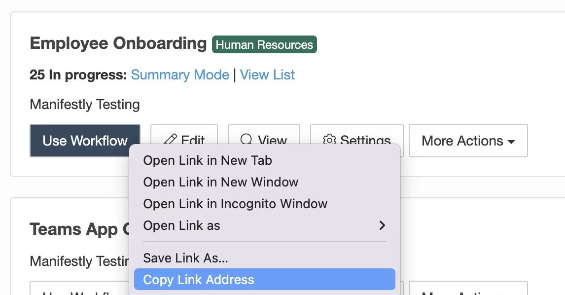 After you set up your workflow run links, they will be listed in the More Actions for the workflow. This animation shows how to grab the URL of a Run Link.