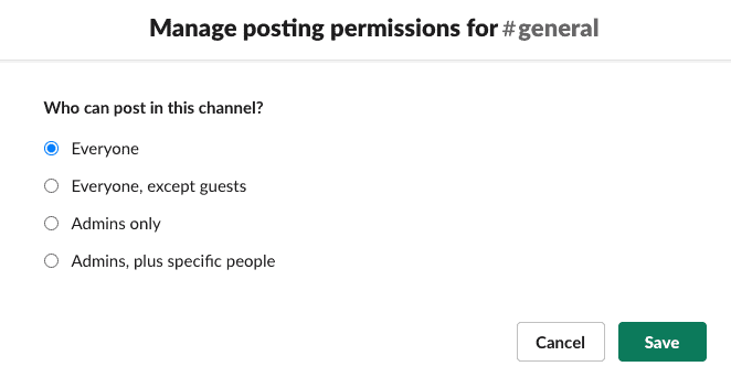 In Slack, you can control who has posting capabilities into channels. Every Slack account has this capability for the #general channel, while Plus and Enterprise plans can change this setting for any channel. It looks like this: